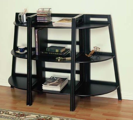 Free-standing corner bookcase styled to maximize space. Use alone or group together with additional corner and rectangular bookcases. Features "Antique Black" with sand through terra cotta finish with transitional styling, straight edge frame, and curved edge shelves. There are five shelves that are tiered from small to large from the top. Folding sides with drop down shelves for assembly. The set includes one Small regtangular shelf and two matching corner shelves. Dimension: Rectangular Bookcase: 22" x 18 1/2" x 40" tall, Corner Bookcase: 18 1/2" x 18 1/2" x 40" tall (each) .