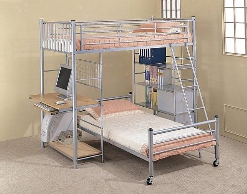 Twin Bunk Bed with Casters, Computer Station, Bookshelf and Ladder. Enjoy the total usability of this bedroom furniture set designed specifically for space saving and style. This set is made of sturdy welded metal beams and includes a full computer work desk, book shelf and lower bed with casters for mobility, all to make sure your child has an excellent environment for study or play, while utilizing the maximum potential of space in the room. Wood pieces are used for the desk and shelving. Specifications: Dimensions: 83"L x 42"W x 72"H. Style Type: Modern. Materials: Metal, Wood. Color: Satin Silver. Pieces: 2. Finish: Gloss Paint. Additional Information: Manufacturer: Visiondecor Instructions. Assembly required.