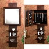 Wonderfully unique; this stylish espresso jewelry armoire is an ideal solution to keep you organized. The square cabinet body opens to reveal multiple jewelry storage options while three ladder shelves add a convenient display area for perfume, jewelry boxes or other decorative d?cor. Seven double hooks, two earring racks, seven ring holders and an organizer tray for assorted pieces are available within the cabinet. Completed with a beveled mirror on the front, this stylish jewelry storage option is perfect for bedroom, bathroom or entry. Features: Constructed with hardwood veneer over MDF and a beveled mirror Espresso Finish 7 double hooks 2 rows of earring storage 7 rows of ring storage 1 removable tray organizer 3 fixed shelves Hangs on the wall as easily as a picture No assembly required Specifications: Overall Dimensions: 46" H x 18" W x 5.25" D Cabinet Dimensions: 18" H x 18" W x 5.25" D Shelf Dimensions: 5" H x 12" W x 4.5" D Weight: 31 lbs